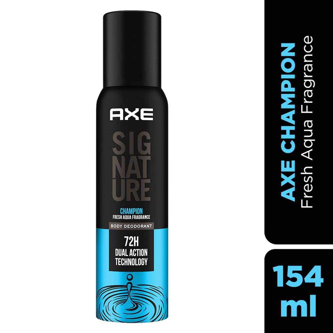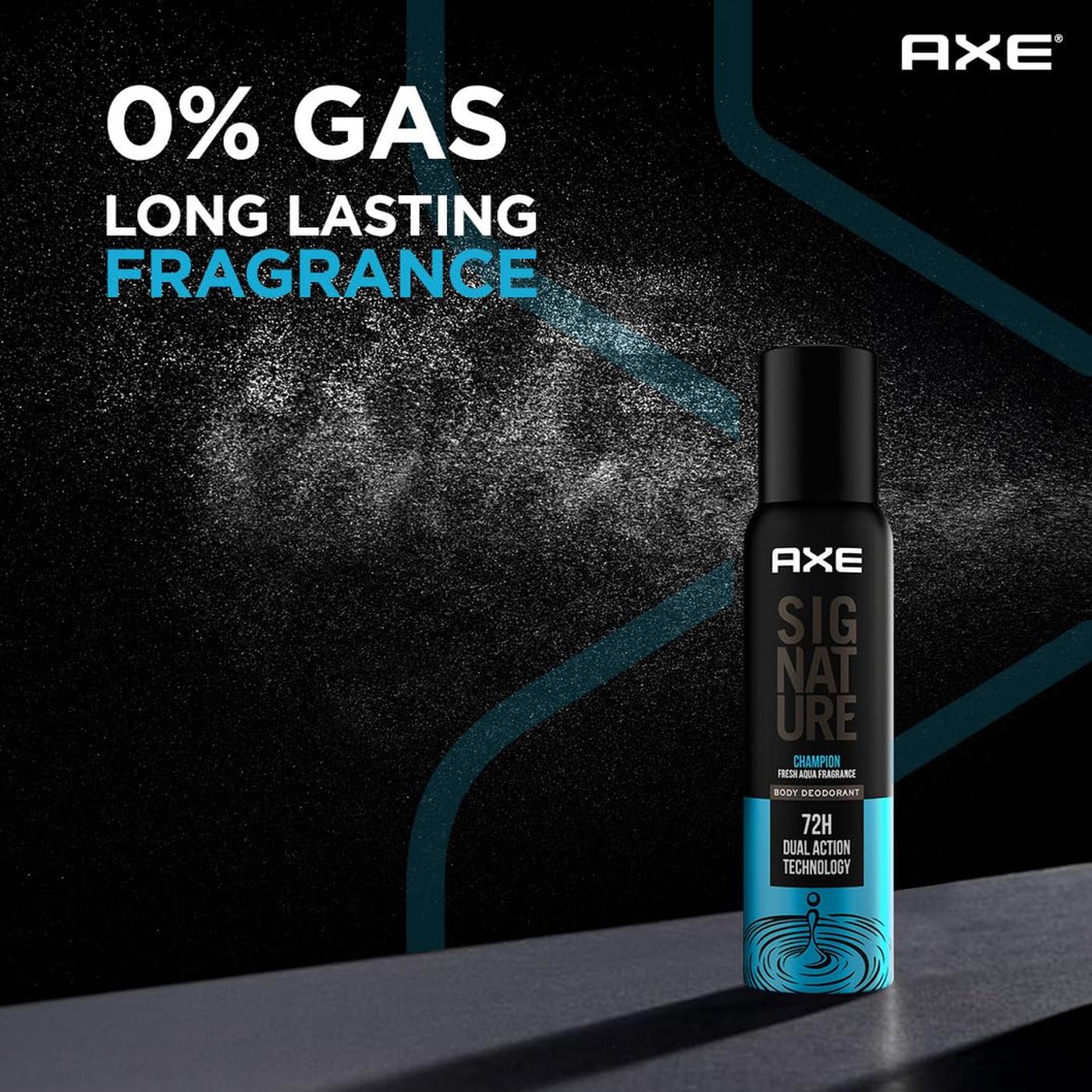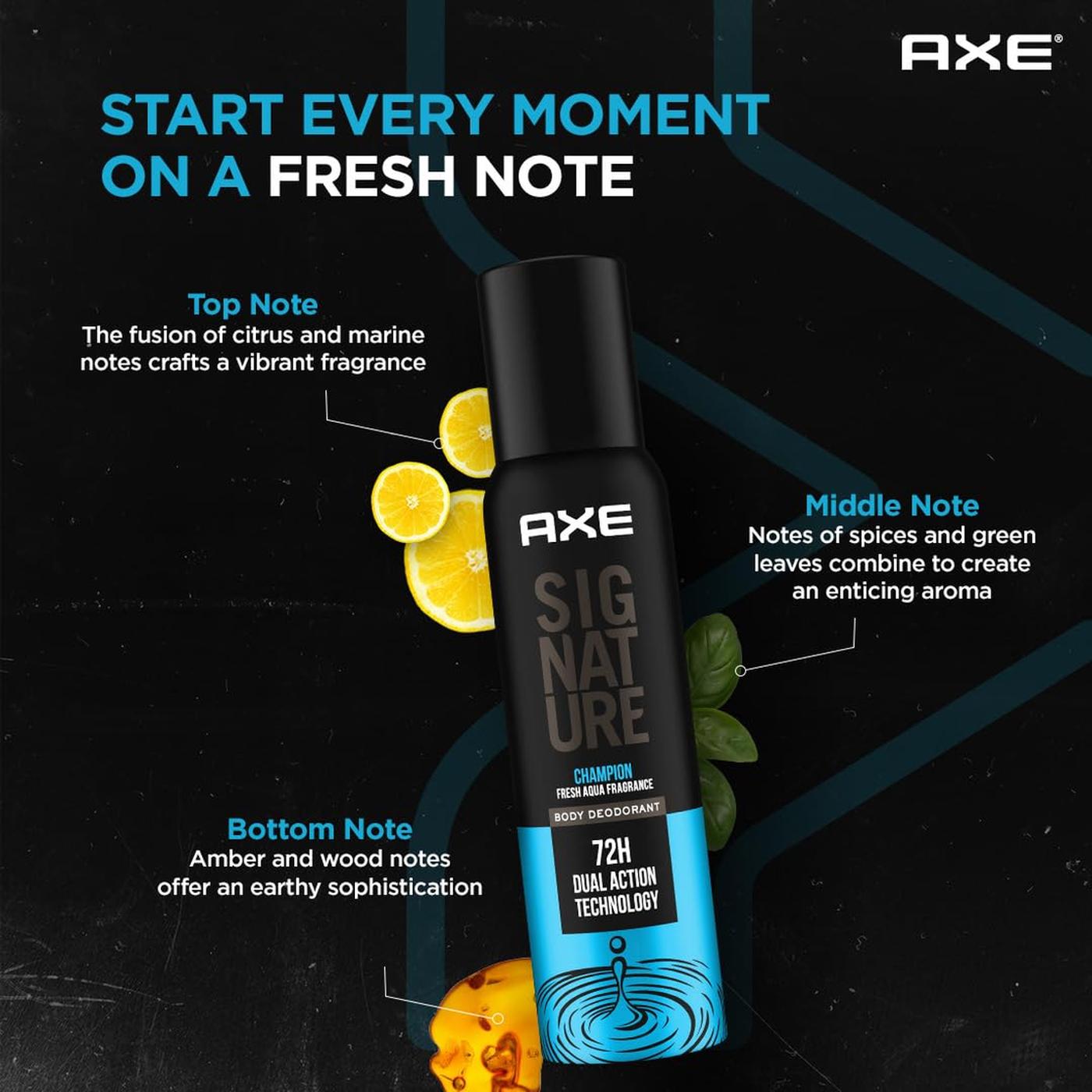 Step up your game with AXE Signature Champion, a powerful no gas body perfume spray designed to keep you smelling fresh and confident all day. Infused with an energetic mix of lemon, mandarin, and refreshing aquatic notes, this fragrance gives you an instant boost of freshness that lasts.