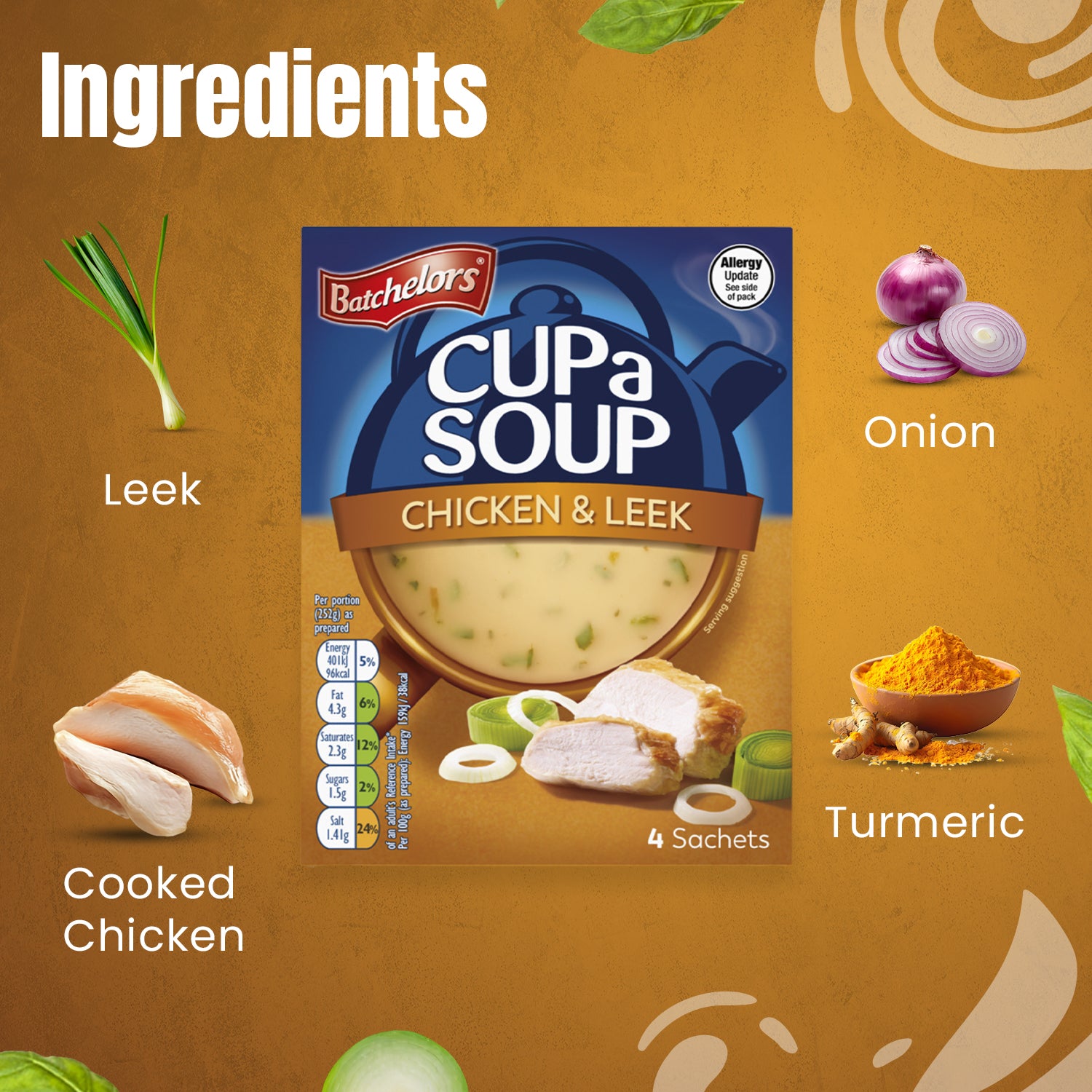 Water, leek (5%), glucose syrup, onion (3%), maize starch, palm oil, cooked chicken (1%), salt, yeast extract (contains barley), milk proteins, flavour enhancers (monosodium glutamate, disodium 5′-ribonucleotides), emulsifiers (citric acid esters of mono- and diglycerides of fatty acids, mono- and diglycerides of fatty acids), flavourings, ground turmeric.