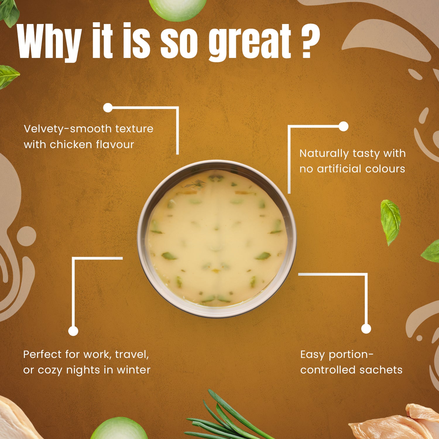 Water; Ring noodles (10%) made with water, wheat flour, salt; cooked chicken (5%); leek (3%); glucose syrup; potato and maize starch; salt; yeast extract (contains barley); flavourings (contain wheat); parsley; flavour enhancers (monosodium glutamate, disodium 5′-ribonucleotides); ground turmeric; black pepper extract.