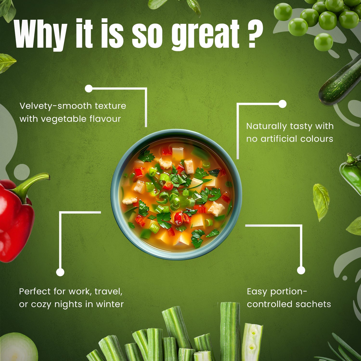 A comforting instant Golden Vegetable soup, each box includes 4 sachets and weighs 82 g. It’s designed for quick snacks or light lunches, offering a warm veggie blend that's both satisfying and light. The product is low in fat and sugar, contains no artificial colors or preservatives, and is suitable for vegetarians.