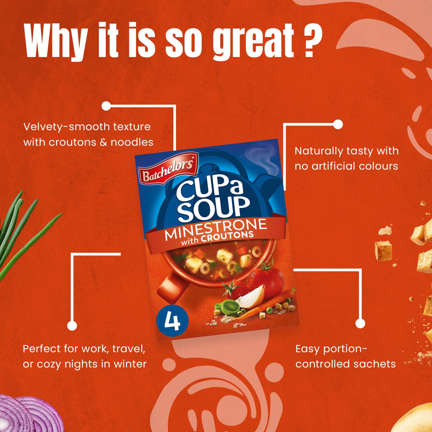 A classic instant Minestrone soup featuring noodles and croutons. Just add hot water for a cozy, warming cup of soup. Each 94 g box contains four sachets and is suitable for vegetarians, low in fat and sugar, and free from artificial colours and preservatives