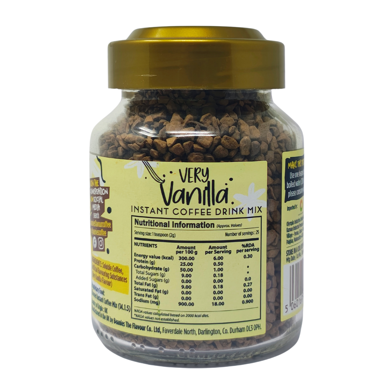 Bringing together the strong coffee flavour and the sweetness of vanilla to create a rich and velvety experience. Beanies Very Vanilla Instant Coffee has a deep, rich vanilla flavour in every cup.