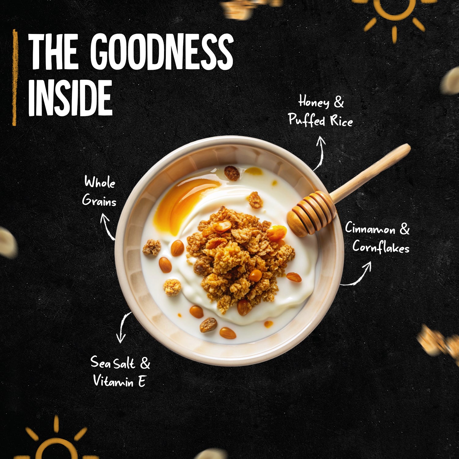 Infused with Natural Honey: Sweetened with real honey, this granola provides a naturally smooth and comforting flavour. It avoids artificial sweeteners, giving a pure, clean taste while maintaining the perfect balance of sweetness to enhance the oat and rice puff combination.