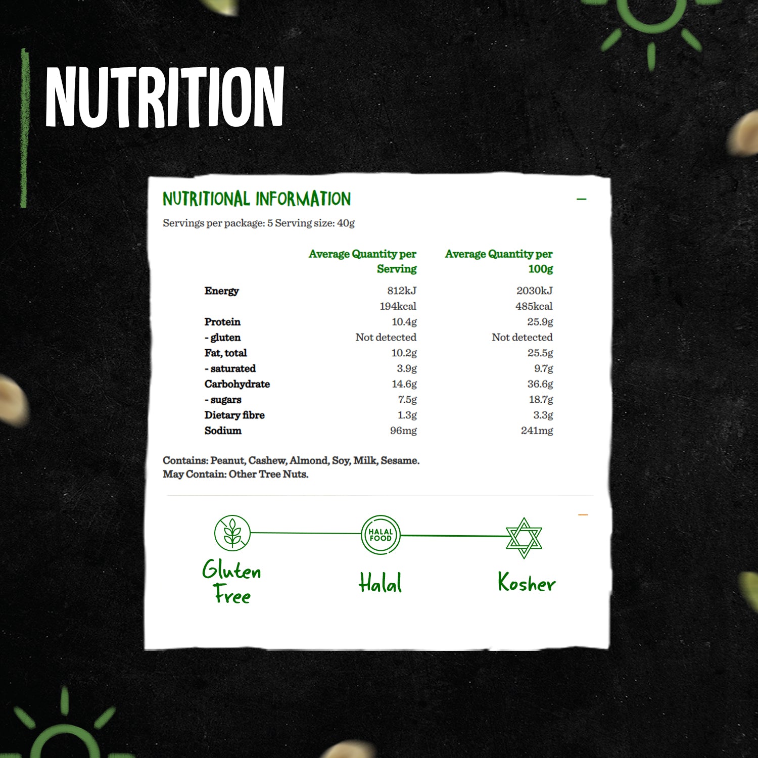 Balanced Nutrition for Wellness: Combining protein, fibre, and healthy fats, this bar delivers a nourishing and satisfying snack that fuels your day while keeping you energised and full.