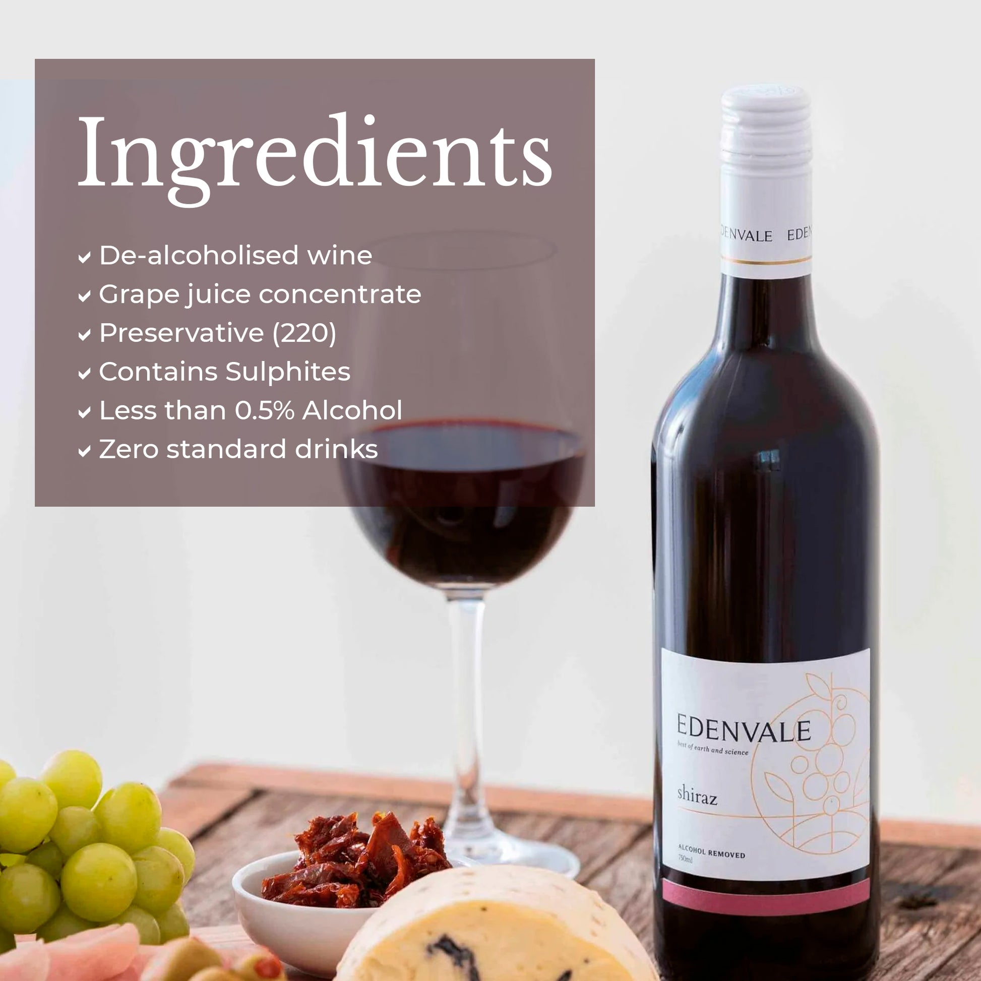 Edenvale Shiraz is a non-alcoholic (alcohol-removed) red wine from South Eastern Australia, containing less than 0.5% ABV—comparable to the alcohol levels in natural fruit juices