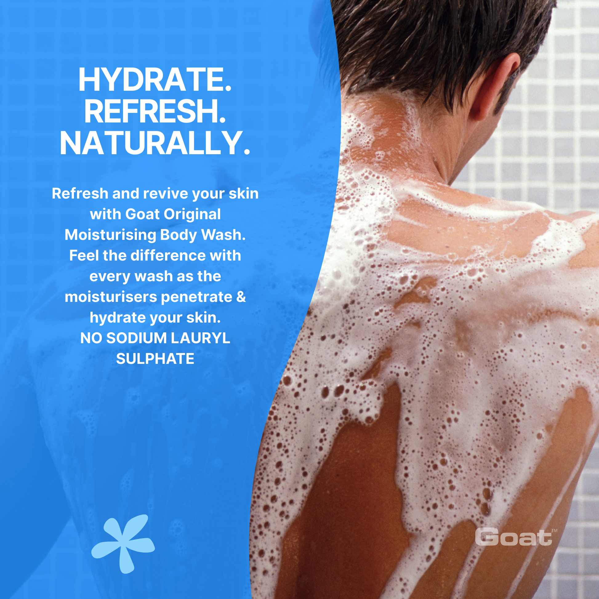 Refresh and revive your skin with Goat Moisturising Body Wash. Feel the difference with every wash as the moisturiser penetrates and hydrates your skin.