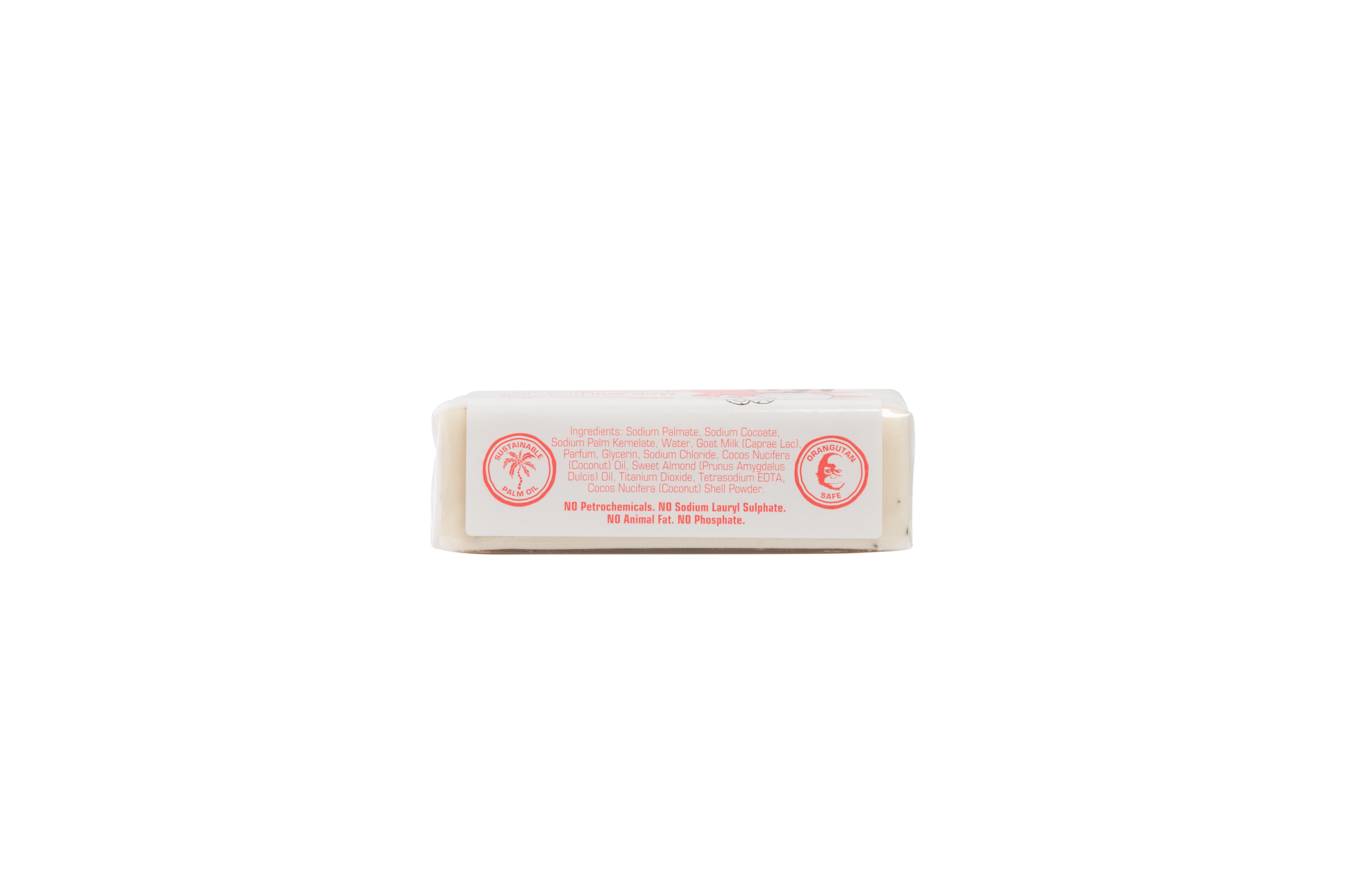 Ingredients Sodium Palmate, Sodium Cocoate, Sodium Palm Kernalate, Aqua (Purified Water), Goats milk Powder, Pure Goat Milk, Vegetable Glycerin, Sodium Chloride, Parfum (Fragrance), Cocos nucifera (Coconut) Oil, Sweet Almond(Prunus Amygdalus dulcis) Oil, Cocos nucifera (Coconut) Shell, Tetrasodium EDTA
