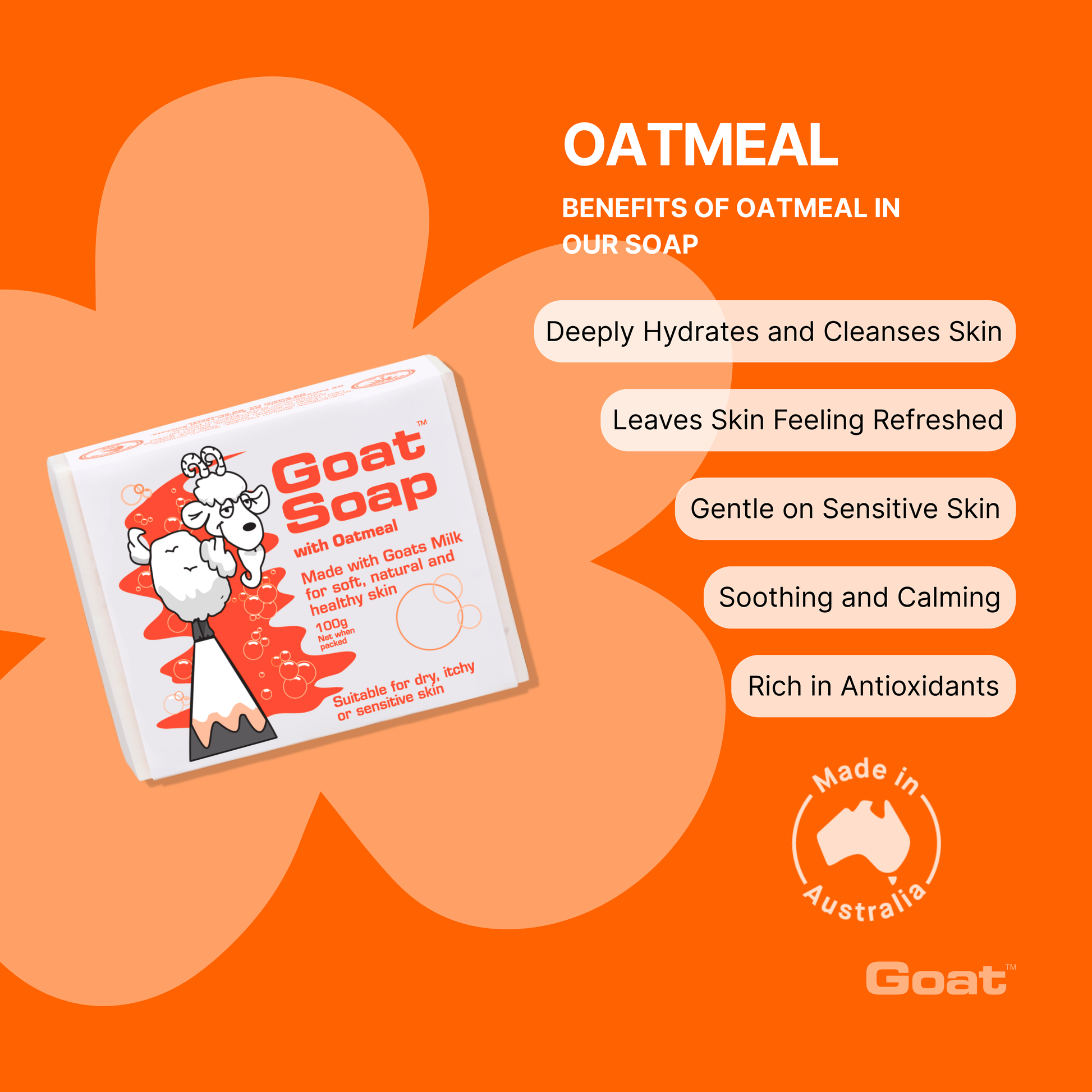 Ingredients Sodium Palmate, Sodium Cocoate, Sodium Palm Kernalate, Aqua (Purified Water),Oat Bran(Avena Sativa), Colloidal Oatmeal, Goats milk Powder, Pure Goat Milk, Vegetable Glycerin, Sodium Chloride, Parfum (Fragrance), Sweet Almond Oil, Tetrasodium EDTA