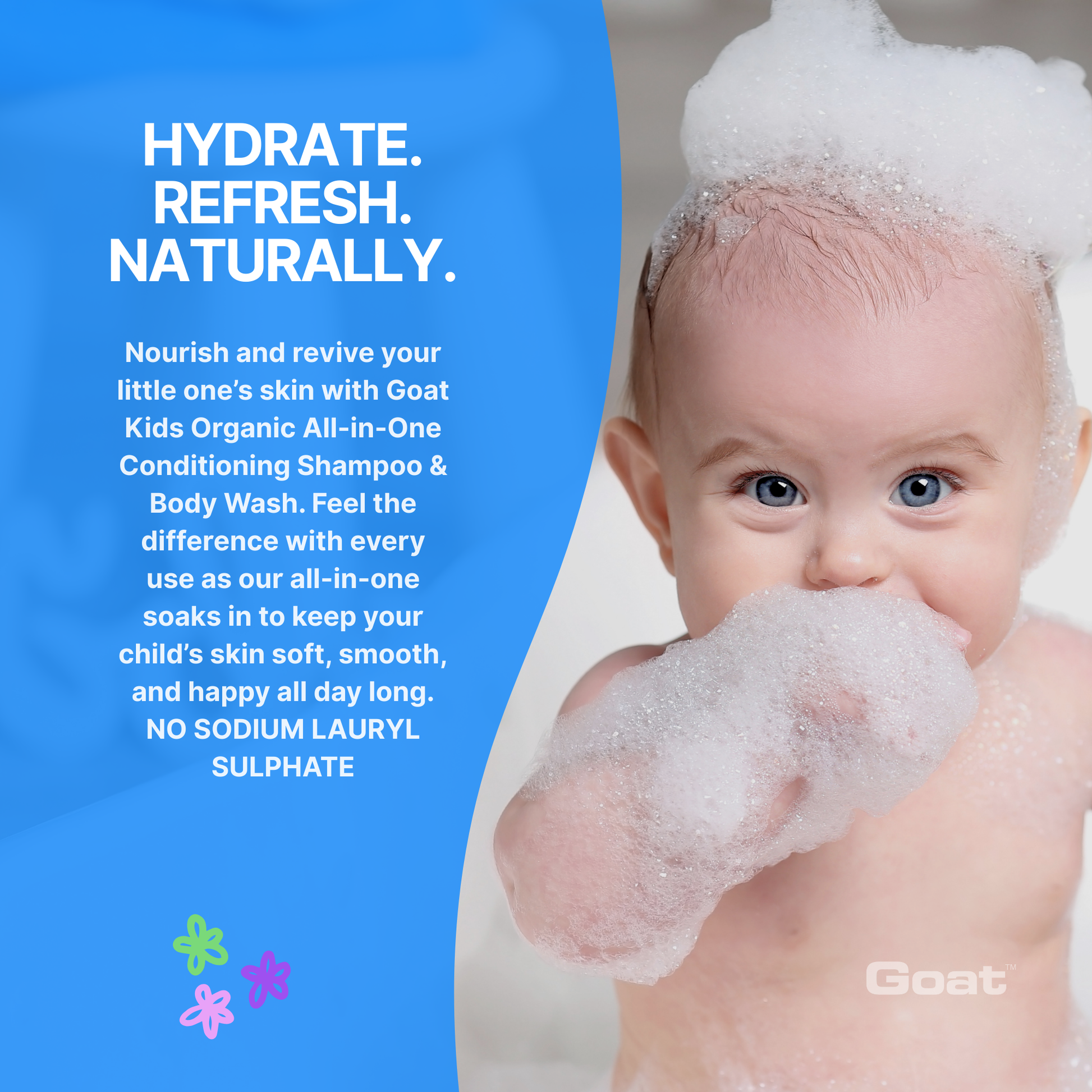 Directions Add a small amount of Kids Goat Organic All-In-One Wash to running bath water or to a sponge/washer/cotton wool and wash your baby’s skin.