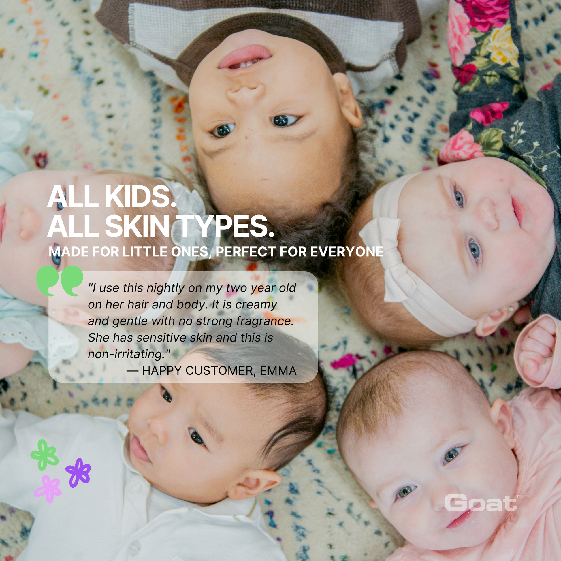 With Goat’s Milk, calming sweet orange and lavender oils. Our naturally fragranced All-In-One Conditioning shampoo and body wash provides a convenient way for your Toddler & Kid’s to enjoy their bath time routine whilst gently cleaning their hair and skin