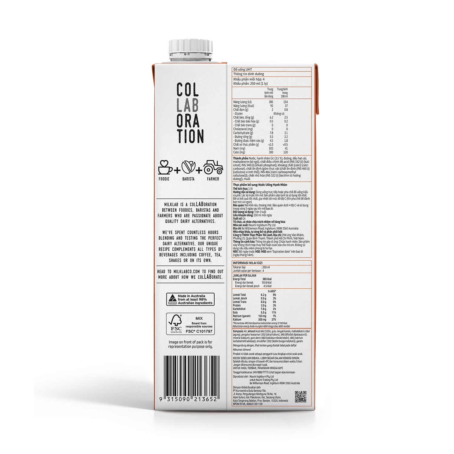 Proudly Aussie-made and owned, unsweetened almond milk are sourced from Northwestern Victoria, helping to ensure our milk’s environmental impacts are minimised. It is also made from at least 98% local ingredients.