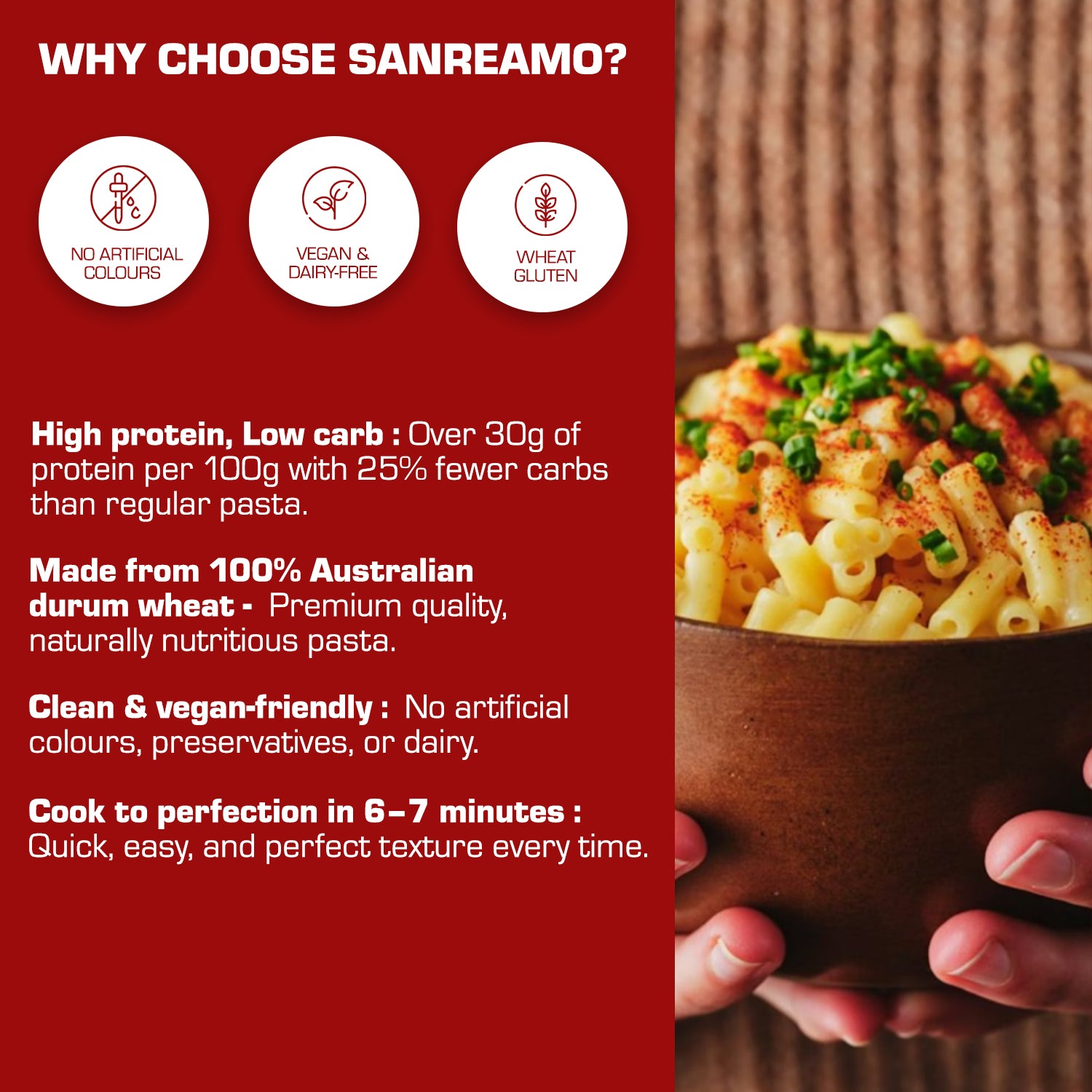PREMIUM QUALITY DURUM WHEAT: San Remo Macaroni Pasta is made from 100% Australian durum wheat semolina. Each piece is carefully shaped into smooth, hollow tubes to ensure consistent cooking and the classic macaroni appearance. Crafted to retain the natural texture and taste of high-quality pasta.