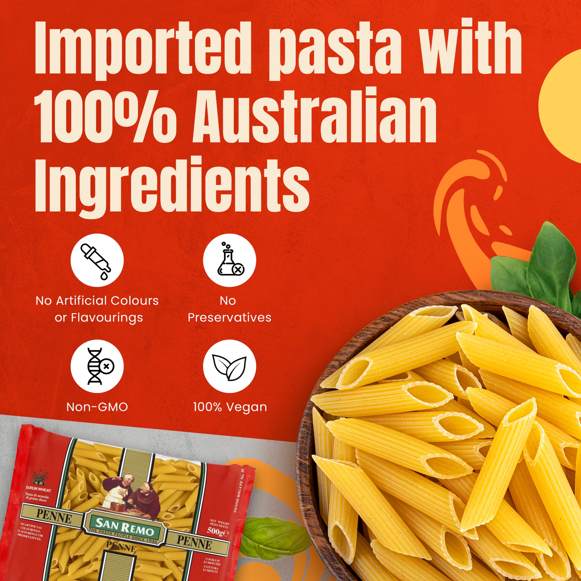 Made entirely with Australian Durum Wheat Semolina, ensuring a delicious and authentic pasta dish. With no maida and no refined flour, penne pasta provides the right texture for a variety of recipes.