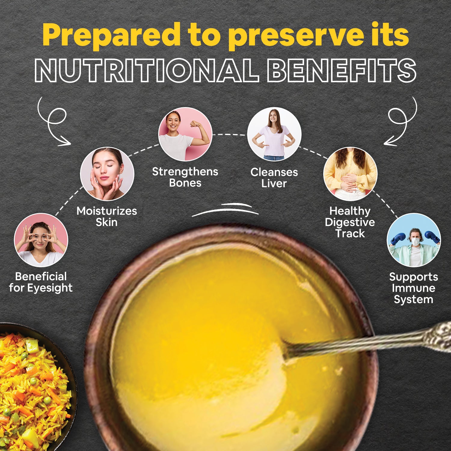 HEALTHY CHOICE- This ghee contains all Ayurvedic and medicinal characteristics. It can also be used guilt-free in diets by health-conscious individuals. The substantial nutrition may benefit people of various ages, from toddlers to the elderly. It is easily absorbed by the body and aids in the absorption of other nutrients for optimal performance. Make use of this ghee in your self-help or wellness dishes.