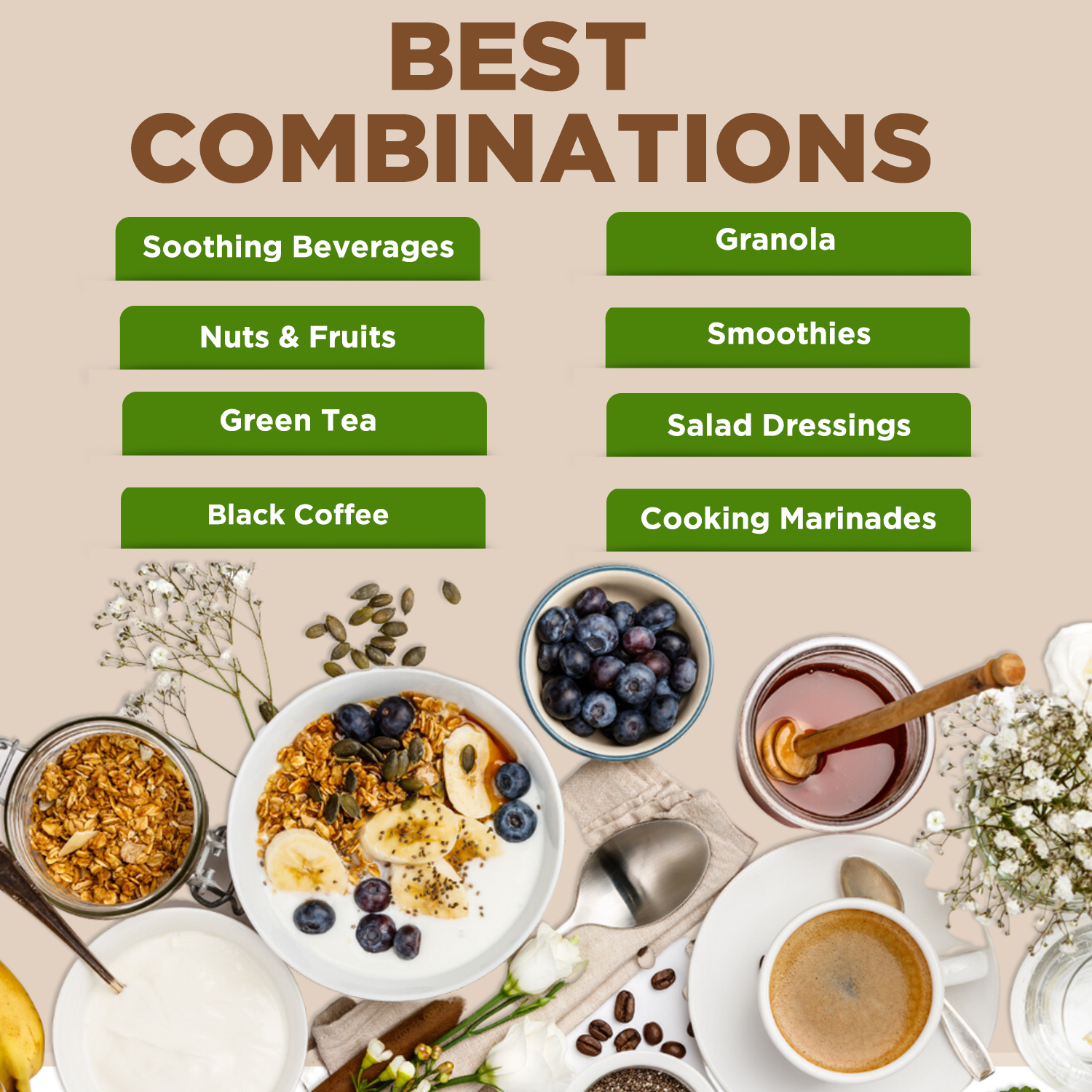 VARIOUS CULINARY USAGE- This honey and ginger infusion is perfect for a variety of culinary uses. It can be used as a sweetener in tea, coffee, or smoothies, drizzled over yogurt, or incorporated into salad dressings for a unique flavor character.